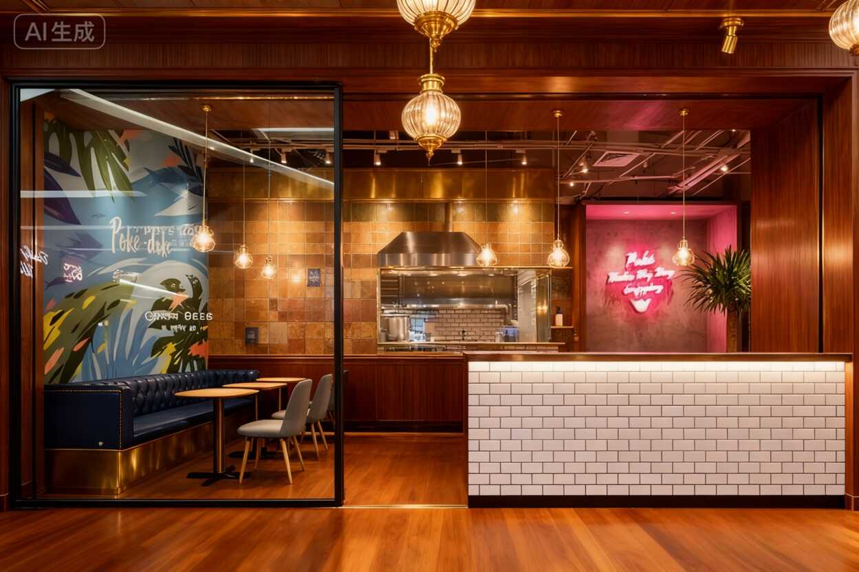 寶子們!今天刷到這家餐廳的軟裝設計,真的被驚艷到了!白瓷磚墻上掛滿彩色卡片的設計太絕了——"SALMON""ALOHA"字樣和棕櫚樹圖案隨風擺動,瞬間把你拉到夏威夷海邊。深藍色卡座配木質(zhì)圓桌,色彩碰撞恰到好處,復古球形燈泡一照,整個空間彌漫著度假般的松弛感!