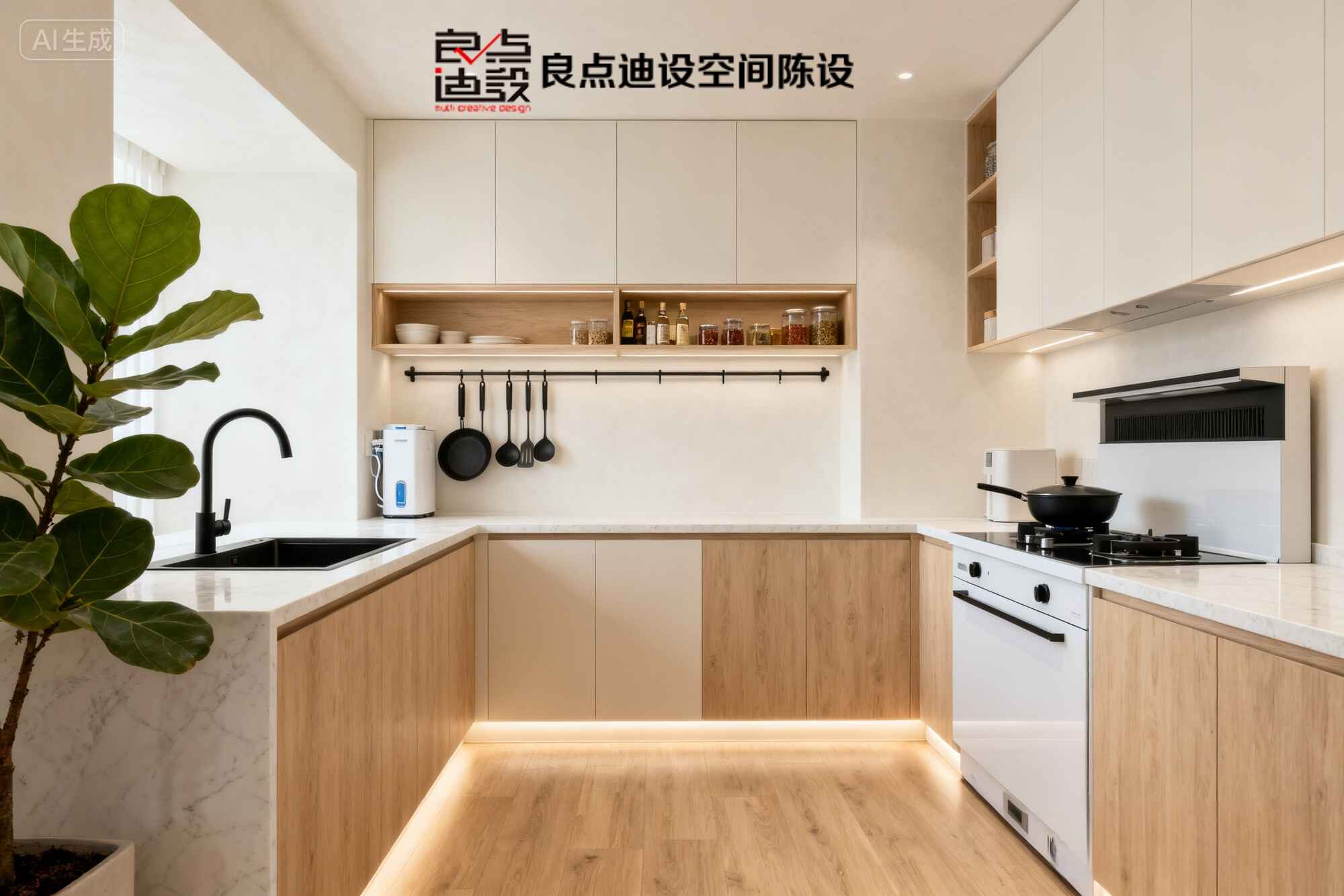 水槽邊那抹綠植簡直是靈魂一筆!瞬間打破單調,生機勃勃的氛圍拿捏得死死的~白色家電***融入整體色調,暖光燈一開?嗬!立馬變身美食博主拍攝現場!??