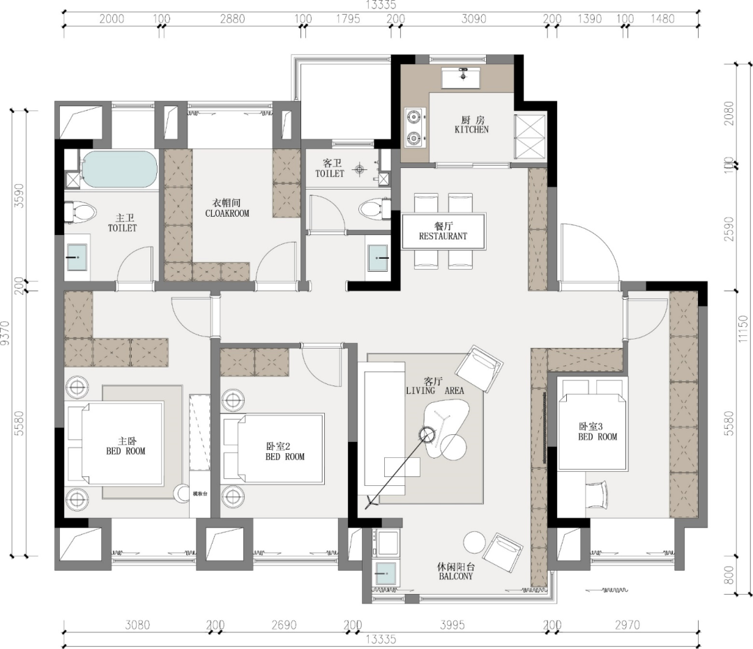 設計思路:陽臺打通,打造多功能陽臺。增加門廳換鞋柜和餐廳餐邊柜的儲物功能,保留獨立書房。臥室3增加儲物空間。