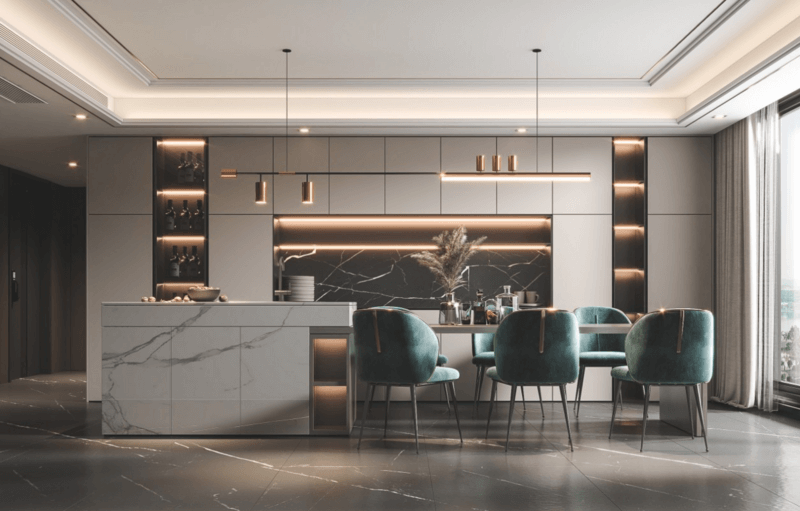 島臺的存在連接了餐廳和廚房,讓廚房不在是一個(gè)人的做飯空間,讓餐桌不再只是一個(gè)吃飯的地方,島臺集收納、料理、用餐與日常休閑和交流情感于一體,讓整個(gè)家庭氛圍更加的和諧。